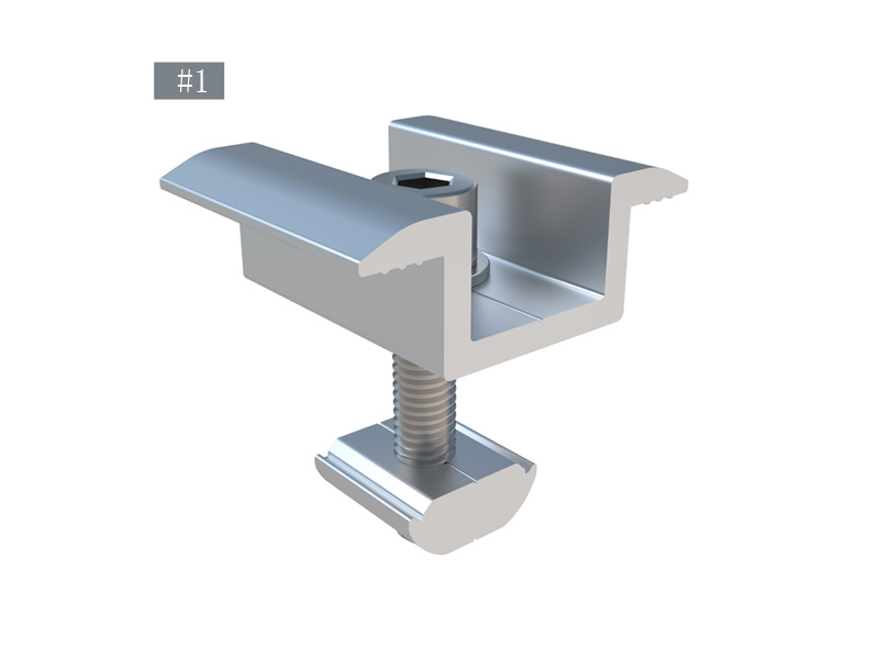 O Grampos centrais do suporte de montagem em trilho são suportes de alumínio com parafusos de aço inoxidável que prendem os painéis solares firmemente ao suporte subjacente. Existem grampos dos tipos 1 e 2 para orientação vertical e transversal dos módulos solares.